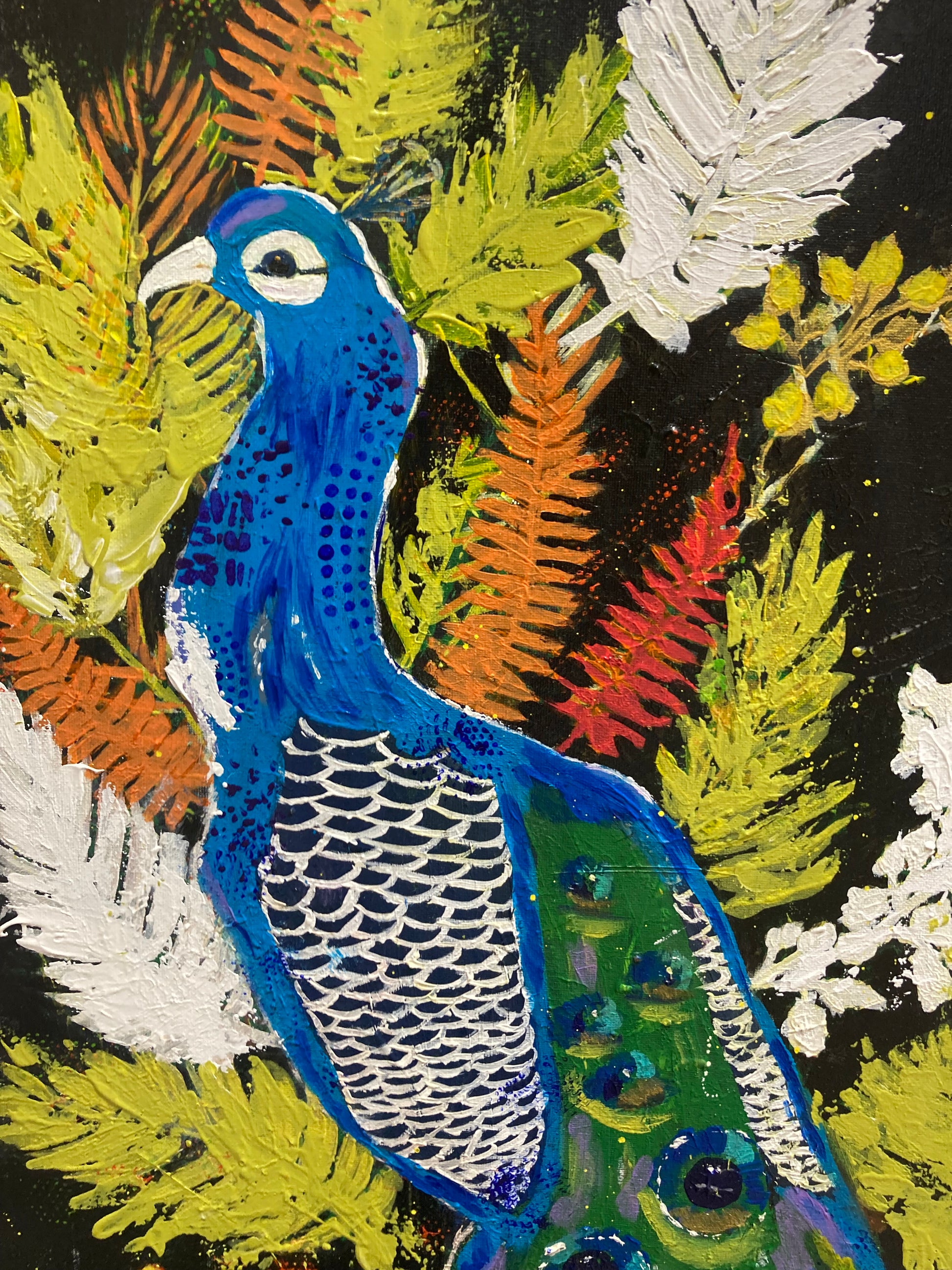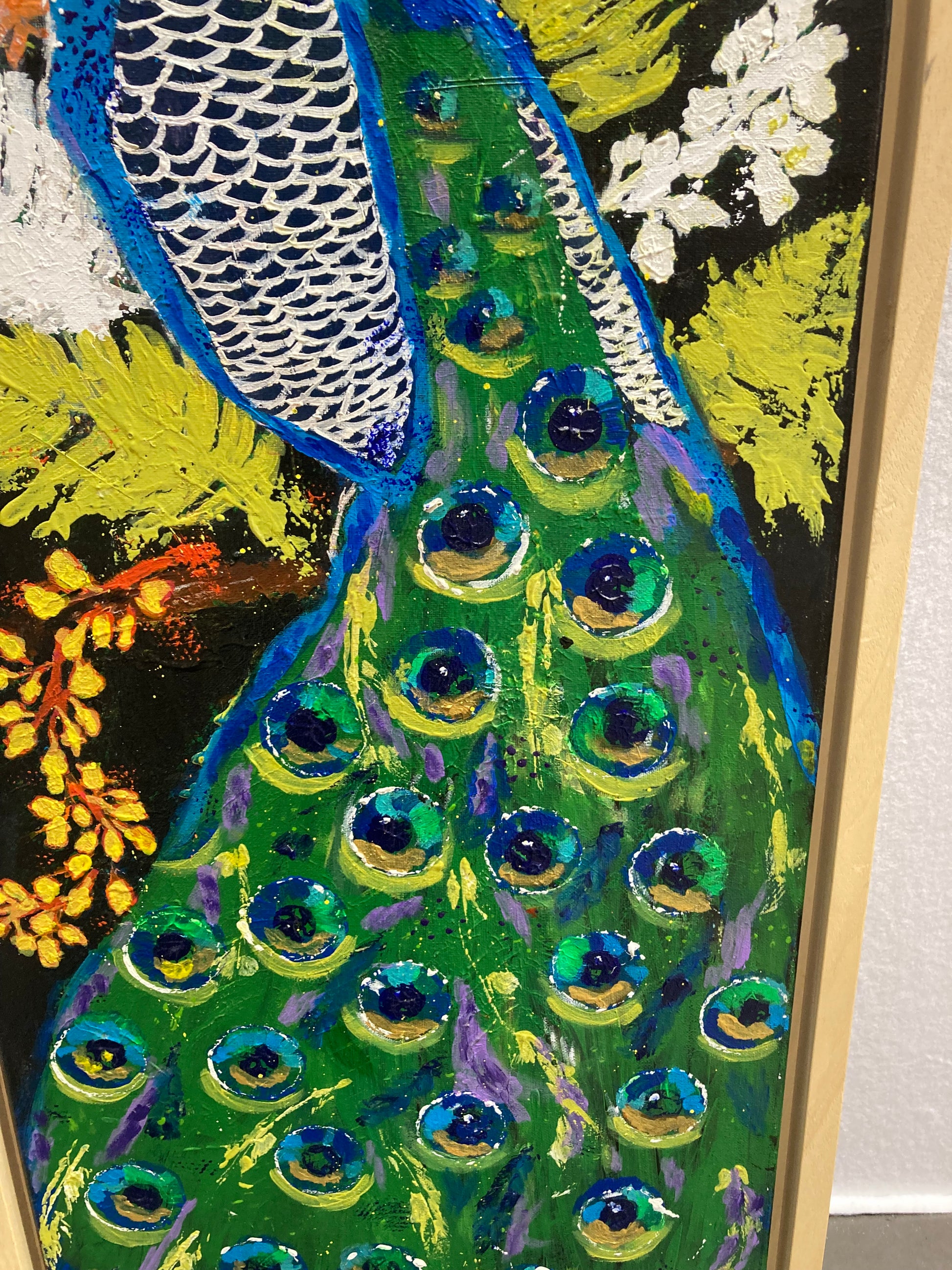 Majestueux et éclatant, Peter Paon déploie toute la beauté de son plumage dans une composition à la fois élégante et vibrante.