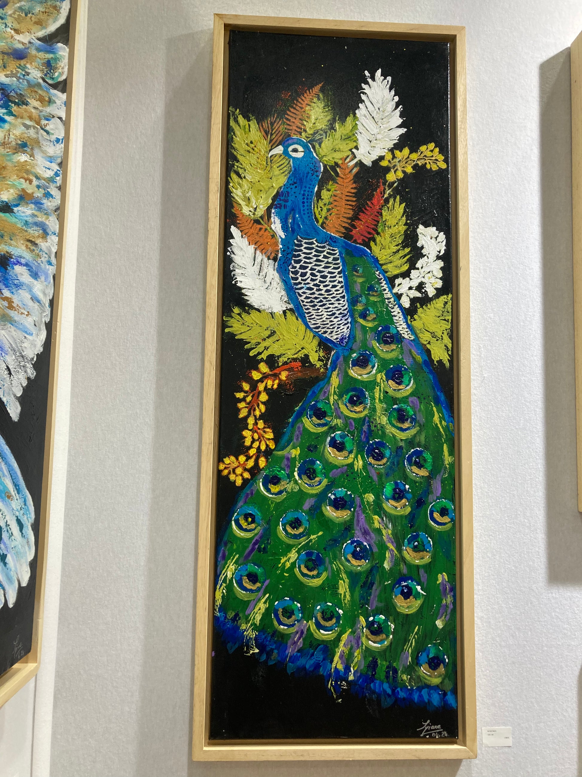 Réalisée à l’acrylique sur toile, cette œuvre originale met en lumière l’oiseau royal dans toute sa splendeur : un plumage riche en détails, des teintes profondes de bleu et de vert, sublimées par des touches lumineuses qui rappellent la fête et la vitalité. Le fond sombre met en valeur les contrastes et intensifie la force visuelle du sujet.